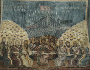 Image mise en avant : Icône syriaque du XVe siècle représentant l’empereur Constantin et les 318 pères ( Domaine Public)