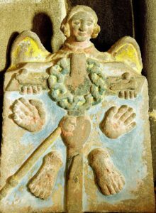 En effet, l’ ange porte la croix sur laquelle le Christ est mort. On peut également voir les cinq plaies de la Crucifixion :